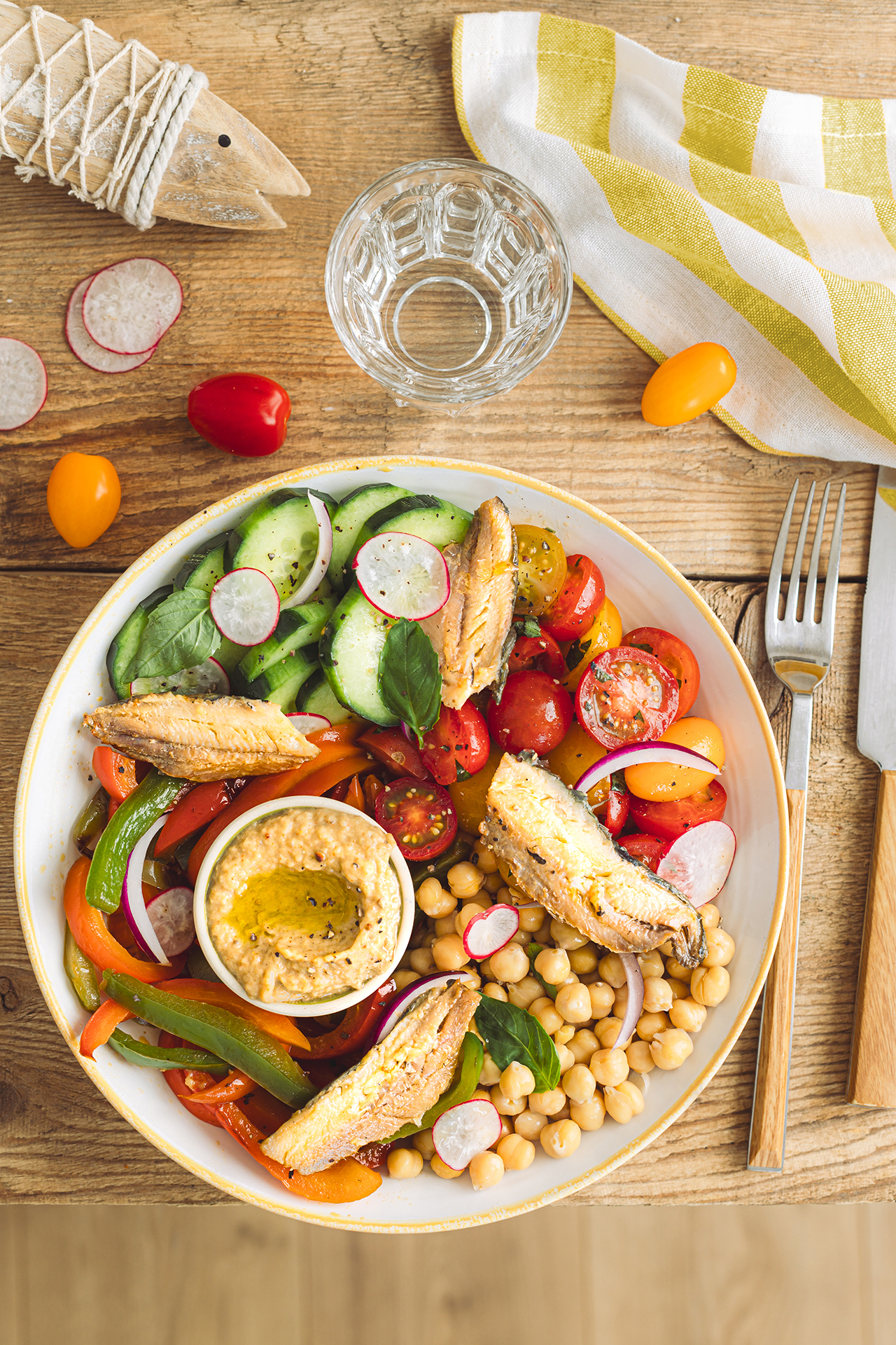 Bowl aux Sardines, Pois Chiches, Poivrons, tomates cerises et caviar d'aubergines