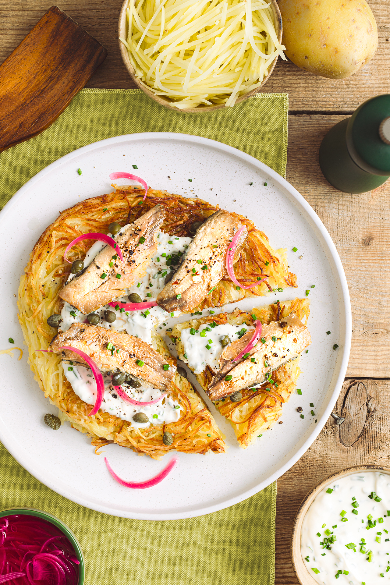 Rosti de pommes de terre et sardines à la crème de ciboulette