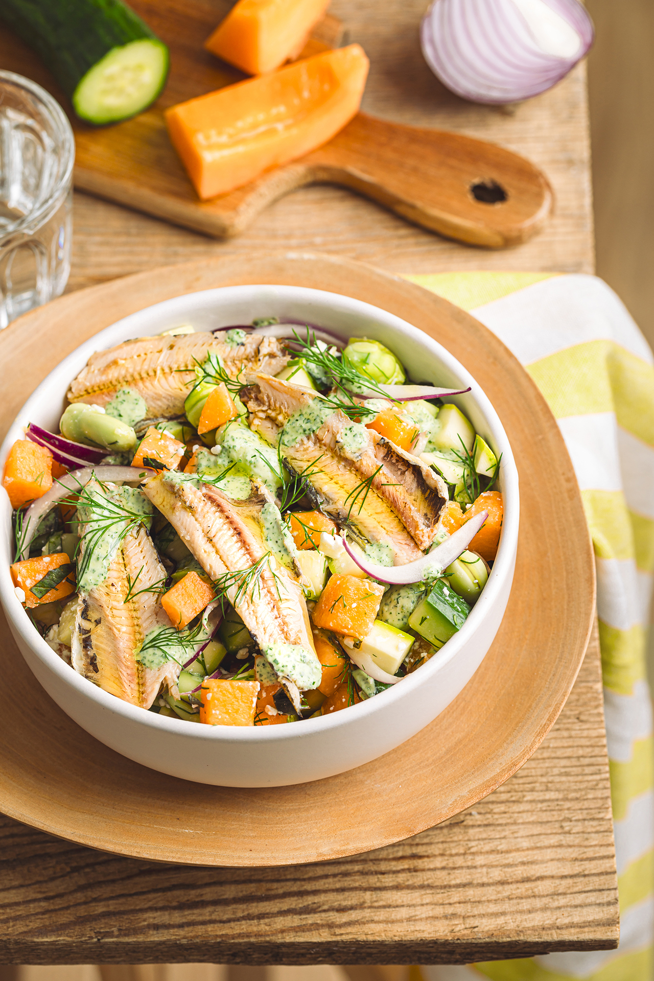 Tartare de légumes d'été, sardines et à la sauce crémeuse au basilic