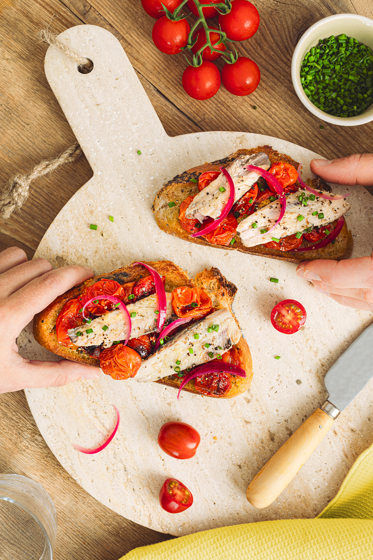 Toast à la sardine et à l'ail, tomates cerises rôties et pickles d'oignons